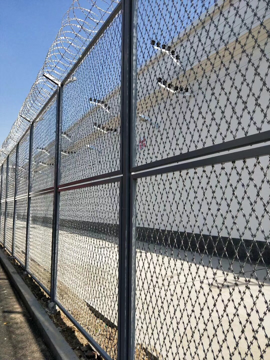 內4米高隔離網這里說的是我們監獄、監區使用的一款隔離網,用于防止犯人逃跑設立的一款隔離網。內4米高隔離網監獄隔離網由邊框,Y型立柱,V型支架,加強型焊接片網,安全防盜連接件和刀片刺籠這些構件組成。客戶要詳細說明這些組成構件的材質、規格,例如監獄隔離網的刀片刺網是采購不銹鋼304材質刀片刺網還是鍍鋅材質刀片刺網。V網是否折彎或者增加加強筋,有的客戶為了造價低也選擇不用V網,而是在形柱上焊接刺繩勾,直接把刀片刺繩掛在立柱上,用4根3mm左右鍍鋅絲加固。