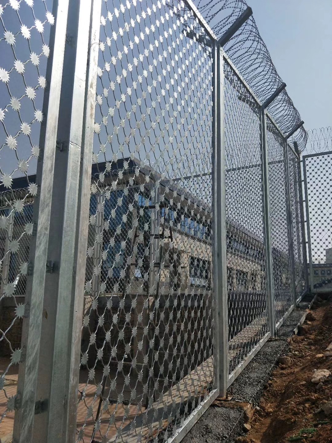 梅花刺片隔離網具有嚇阻、防翻越等效果材質堅硬高強度張力, 造型設計獨特,不宜觸摸因而能達到極好的防護隔離效果監獄鋼網墻還具有施工簡便經濟實用等優點,專用于監獄看守所、哨所、邊防、圍禁區域、軍事防御防護等危險地區的防護。