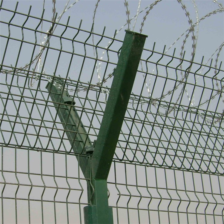 新型機場圍網是現在安裝非常多的機場圍界又稱作“Y型安全防御網”,是由V型支架立柱,加強型焊接網片,連接件和熱鍍鋅刀片刺絲網組成。無論是強度和安全防御等級都非常高。立柱要求:Y型柱,底部焊接法蘭盤固定在混凝土地面上。立柱多為方管60*80mm厚度為2.5mm頂部呈“Y”字型安裝V型網片,再在網片上固定斧型刀片刺圈。斧型刀片刺圈的安裝標準:要求圈間距200mm,用安全卡固定在V型網片上,平均每米安裝5個安全卡即可。關于刀片刺圈的材質,機場標準鍍鋅材質(上鋅量必須在120/m2以上)或者是不鋼材料。國內多用BTO-22型號,圈徑中500mm,如果圖紙有其他要求可以根據圖紙要求制作。