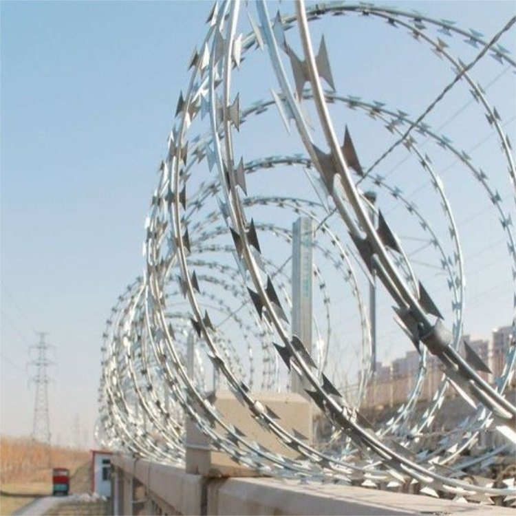 刀片刺網又名蛇腹型刀刺網,是一種近年發展起來的防護,隔離能力較強的安全防護產品,應用在監獄、看守所、別墅、鐵路、機場等對于防護要求嚴格的場所。制作工藝:采用鋼板沖壓成型包附于鋼絲之上,由銳利尖角鍍鋅鋼板或不銹鋼薄板做刀片,高張力鋼絲做芯線組合而成的。鋒利的刀型刺由雙線扣裝后成蛇腹狀,手不能握,腳不能爬,讓人望而生威,不敢靠近,既起到防護作用又美觀。