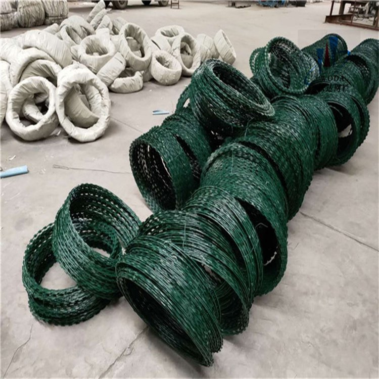蛇腹形(型)刀刺網規格為BTO-22,刺圈直徑300mm,500mm,600mm,800mm,900mm等鍍鋅噴塑。刺繩規格為雙股2mm鐵絲捻扎而成