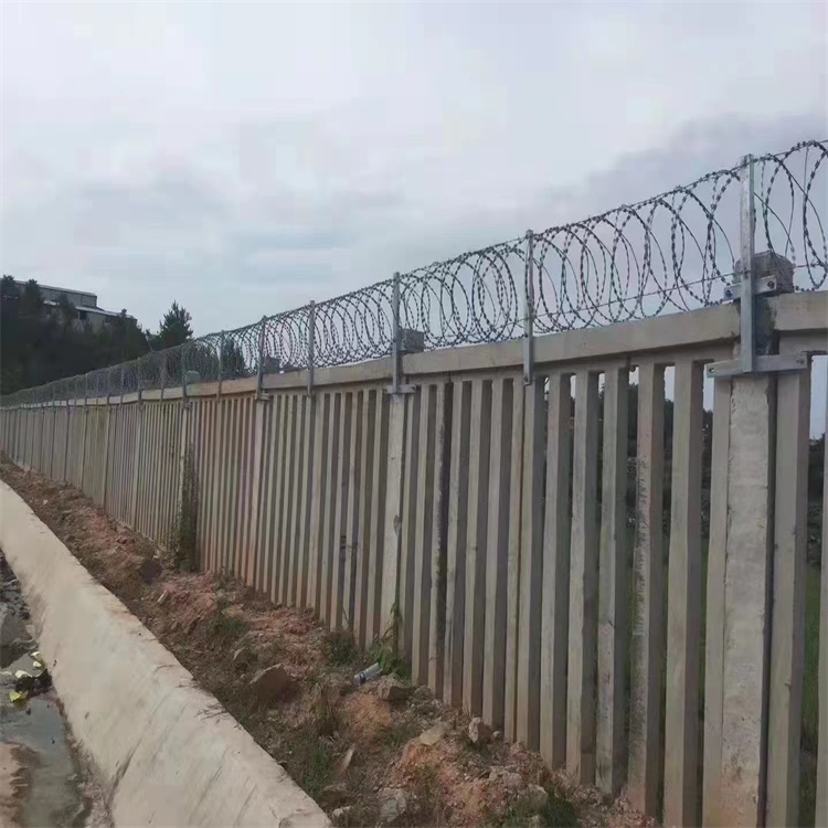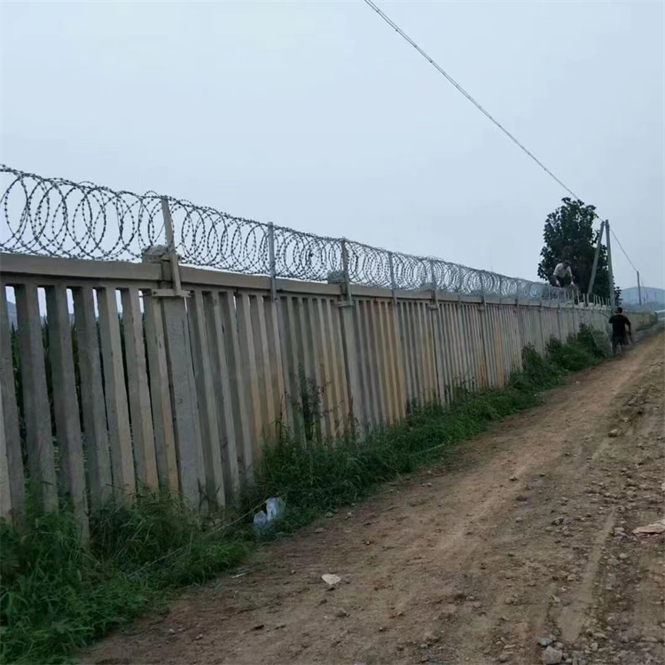(4)的下緣距離鋼筋混凝士防護柵欄上緣的垂直距離為0.05m.鐵路刺絲滾籠是近年防護、隔離能力較強的新型產品,廣泛用于高檔住宅小區、、重要倉庫、監獄、邊防軍事重地等需要封鎖圍禁場所。它的主要構件有:刀刺滾籠( 由鋒利的刀片和高抗拉強度的芯線構成)、縱向掛絲、立柱支架、加密支架、支架抱箍。安裝好的刺絲滾籠能很好地起到阻擋闖入者的作用