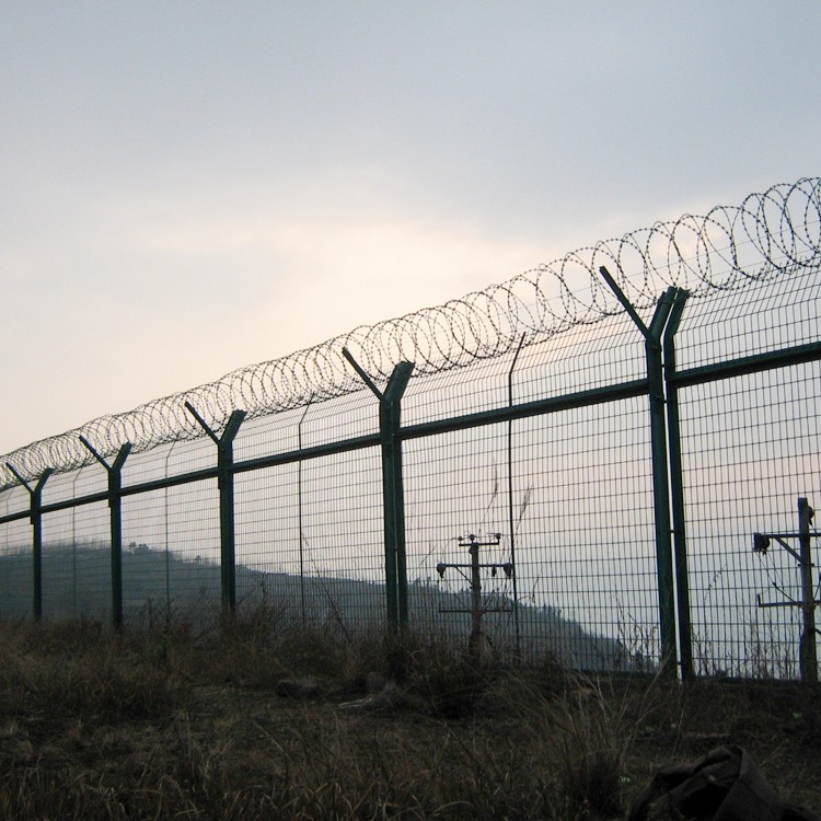 機場圍欄網(wǎng)又稱作“機場安全防御護網(wǎng)”,是由V型支架立柱,加強型焊接片網(wǎng),安全防盜連接件和熱鍍鋅刀片刺籠組成強度和安全防御性級別很高。