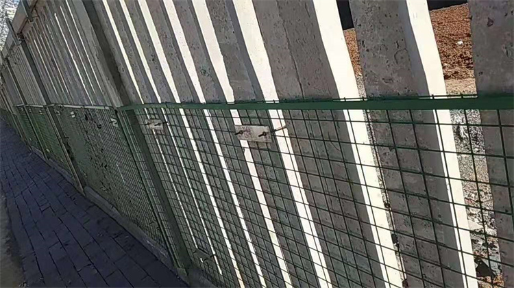 鐵路加密網片之上檻防護柵欄,一般規格也分為1*3米/片、1*1.59米/片、1*1.15米/片,這種需要帶邊框也是通過抱箍進行固定,網片上端可以是直框也可以帶角度折彎,這種是安裝在水泥防護柵欄上部,外觀一般是墨綠色,可掛刺絲滾籠.
