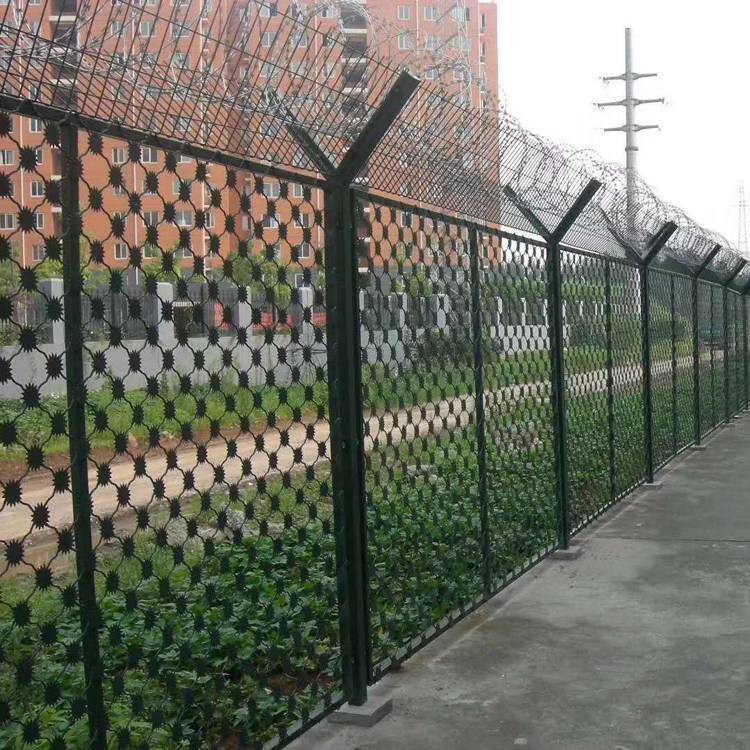 圓柱居多網(wǎng)孔:110*110mm,100*100mm,絲徑:6.0mm,5.0mm,刺片:直徑75mm,厚度1.2mm,14個刺邊框:角鋼50*5mm或者方管40*40*1.5mm及以上規(guī)格立柱:常用圓管中114mm*3.0以上,也可以用80*80、100*100mm方管監(jiān)獄鋼網(wǎng)墻表面處理:一般為浸塑,少部分為熱浸鋅或者噴塑