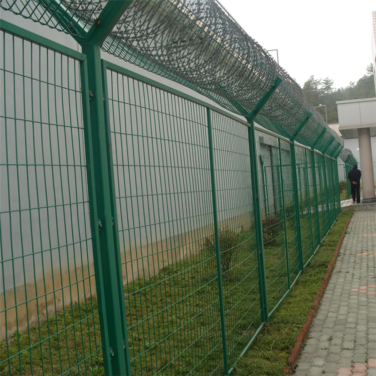 看守所圍網(wǎng)又稱作安全防御護(hù)網(wǎng),是由安全立柱(頂部可帶V型),加強(qiáng)型焊接片網(wǎng),安全防盜連接件和刀片刺籠組成,強(qiáng)度和安全防御級別很高。近年來,被廣泛應(yīng)用在監(jiān)獄,看守所,軍事基地等高安全場所。表面采用電鍍、熱鍍、噴塑、浸塑等防腐形式,具有很好的抗老化、抗曬、耐候等特點(diǎn)。這種看守所安全圍網(wǎng)造型美觀、花色多樣,既起到圍欄作用,又起到美化作用。由于具有安全性高、防攀爬能力好,網(wǎng)片連接方式采用特制SBS緊扣件,有效防止人為的破壞性拆卸,橫向四道折彎加強(qiáng)筋或四周焊接方管邊框,使網(wǎng)面強(qiáng)度顯著增加。