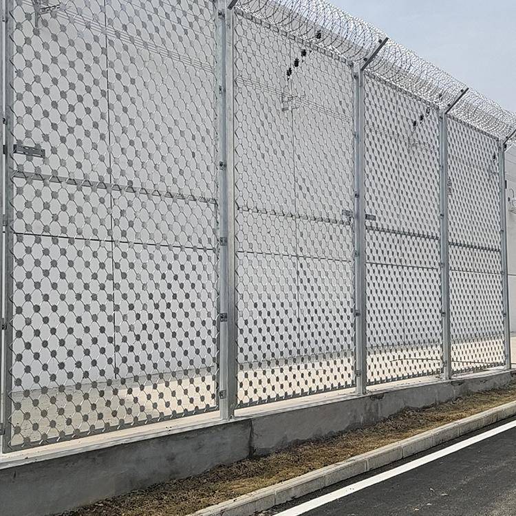 3、美格網片:網片為菱形網孔,網格尺寸:110mm*110mm/80mm*80mm,網絲直徑8mm、6mm等,采用S195結材高壓焊接,每個焊點附焊太陽花刺一個。除了上述材質,監獄太陽花刺片美格網還會采取304不銹鋼等。這是為了具備更高的防腐蝕性能,增加使用年限。一般表面處理為鍍鋅處理。也有浸塑、噴塑。表面常用顏色有銀白色、墨綠色、草綠色、白色、灰色、藍色等等。顏色要求可以根據客戶提供色卡來定制。太陽花刺片網現在用途還比較局限,如果用于普通公眾場合非常容易造成人員的身體傷害。所以其主要使用地區是監獄 看守所、戒毒所、拘留所、軍事區等等場合,具有讓人望而生畏的作用!太陽花刺片美格網,太陽花刺片監獄鋼網墻,防攀爬刺片鋼網墻。