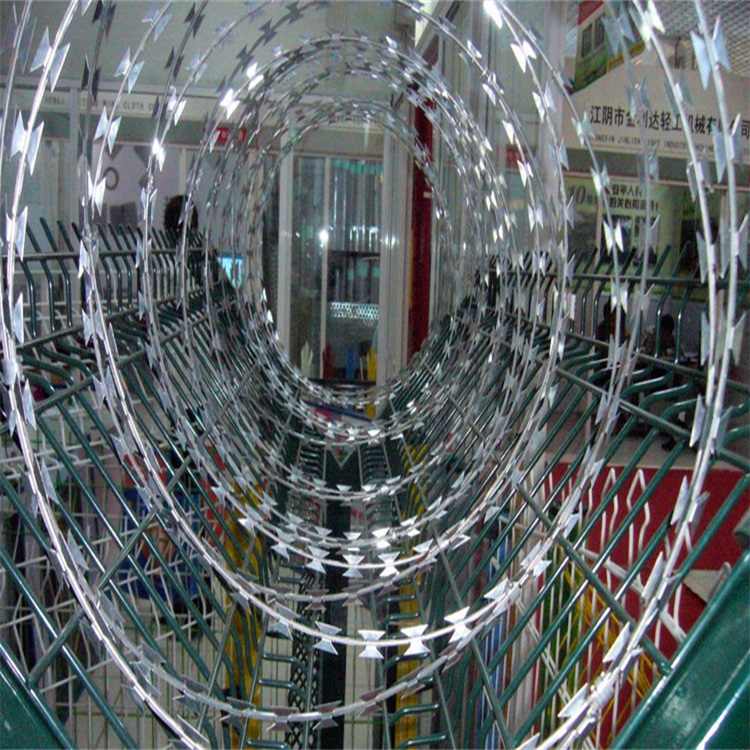 刀刺網大多采用冷拔絲與低碳鋼液壓而成。世界各地的大多數經銷商和制造商都用低價戰略來占領市場。既定單位依照相關規則中止承受??v向拉桿由兩根2.5室米冷鍍鋅鋼絲制成。縱向拉桿被兩根直徑為120室米的2.2室米冷鍍鋅鋼絲盤繞線籠底部邊緣與鋼筋混野十圍欄頂部邊緣之間的垂直間隙為0.05m。滾籠網是由支架,縱向拉筋,抱箍,卡扣刀片刺繩這一系列組成的體系,重要的要數刀片刺繩與支架了,它如今曾經被廣為人知,其作用根本是相同的,都是起到一種阻攔作用,防止不必要的損失。