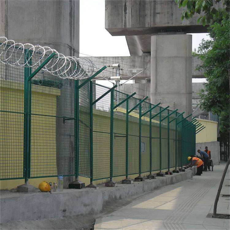 拘留所防攀爬隔離網又稱作金屬鐵絲防爬護欄,監獄通透式鋼網墻,是由安全立柱(頂部可帶V型),加強型焊接片網,安全防盜連接件和刀片刺籠組成,強度和安全防御級別很高。主要用于監獄、哨所、邊防、圍禁區域、軍事防御防護等高危險地區的防護。規格型號可根據需要加工訂做。