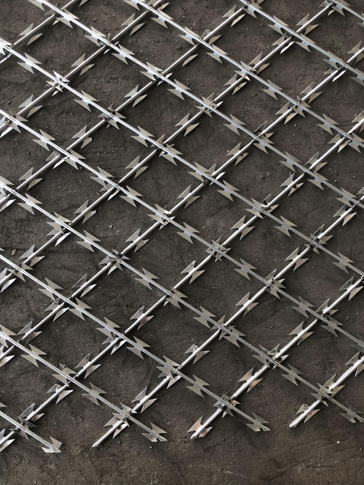 刀片隔離網主要用于園林公寓.機關單位監獄、哨所邊防、看守所、軍事基地等的圈禁防護。刀片隔離網由銳利尖角鍍鋅鋼板或不銹鋼薄板做刀片高張力鋼絲做芯線組合而成的阻絕器材。由于刀片刺繩防護網造形獨特不易觸摸,因而能達到很好的防護隔離效果。直線形刀片刺網是由刀片型直線刺網交叉焊接成型,也是有工人手工把焊接好的刀片型刺網一次交錯排列,防護效果,防攀爬性極高,但也是非常的費時,所以在保證隔離網質量的同時,在做工方面也是極其的耗費時間,也造就了他很強的防御性,和不可逾越性。