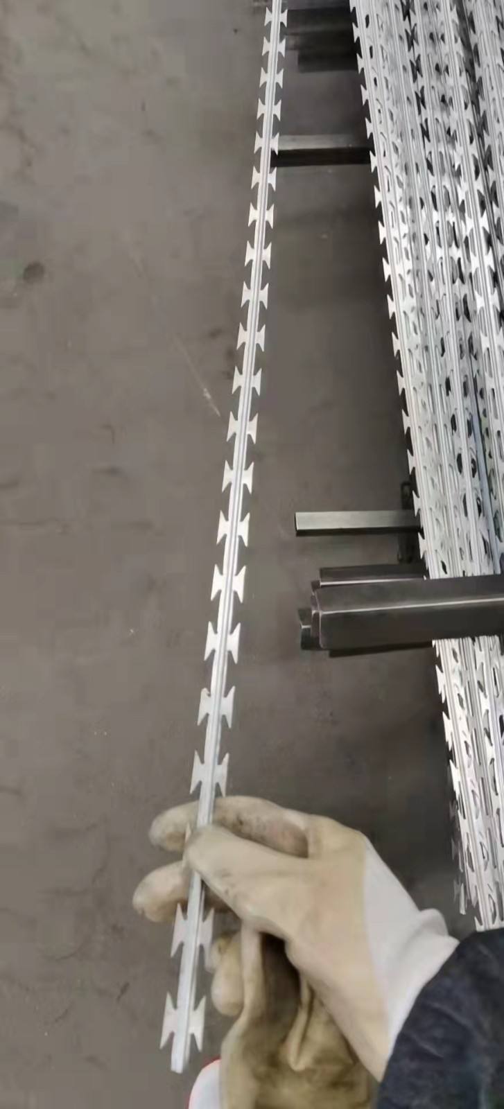 2、安裝好立柱了,先把要安裝刀片刺繩的第一根立柱支架上拉上刺繩,拉上刺繩后,用刺繩把刀片刺網(wǎng)串接在一起安裝卡扣,一般間距在20厘米。