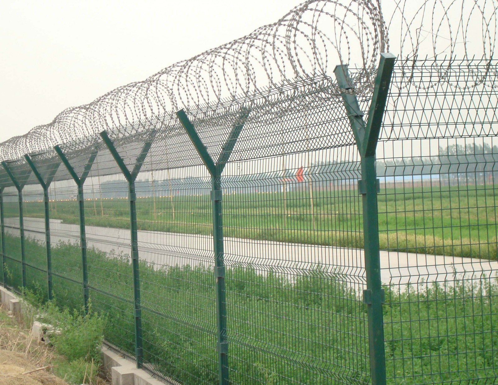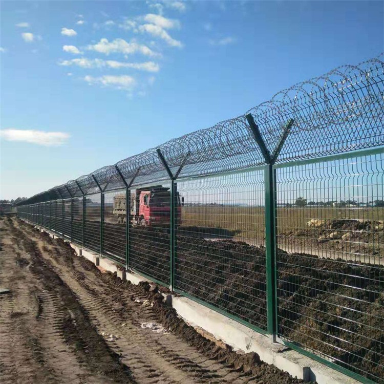 特點:如果在機場圍欄網頂部加裝刀片刺絲、刀片刺繩后又很好的增強了安全防護性能。采用電鍍、熱鍍、噴塑、浸塑等防腐形式,具有很好的抗老化、抗曬、耐候等特點。既起到圍欄作用,又起到美化作用。由于具有安全性高、防攀爬能力好,網片連接方式采用特制SBS緊扣件,有效防止人為的破壞性拆卸,橫向四道折彎加強筋,使網面強度顯著增加。當然我們安裝護欄的意義是即美觀,又可以防止人員和小動物亂入影響飛機的正常飛行。