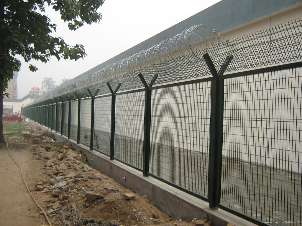 1、焊接網,直接用低碳鋼絲采用焊接的方式連接,又在普通隔離網的基礎上將立柱改成Y型,上方增加了不宜觸摸的刀刺網,增強其防攀爬效果;