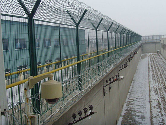 監獄圍墻隔離網具有美觀實用的特點,而且便于運輸和安裝,監獄隔離網可以根據地面的變化上下調節支柱的連接位置,在監獄隔離網頂部添加刀片刺繩,可增強監獄隔離網的防護強度。中度戒備監獄圍墻一般應高出地面5.5m,墻體應達到 0.49m厚實心磚墻的安全防護要求,圍墻上部宜設置武裝巡邏道。高度戒備監獄圍墻應高出地面7mm,墻體應達到0.3m厚鋼筋混凝土的安全防護要求,上部應設置武裝巡邏道。