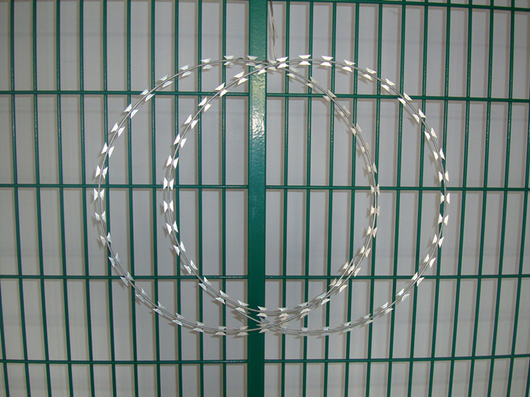 滾網(wǎng)刀片是一種近年發(fā)展起來的防護(hù)、隔離能力較新型防護(hù)網(wǎng)產(chǎn)品。它采用鋼板沖壓成型包附于熱鍍鋅鋼絲(筋絲)之上,銳利尖角鍍鋅鋼板或不銹鋼薄板做刀片,高張力鋼絲做芯線組合而成的。鋒利的刀型刺由雙線扣裝后成蛇腹?fàn)睿让烙^又讓人不寒而栗。起到了很好的阻嚇作用。